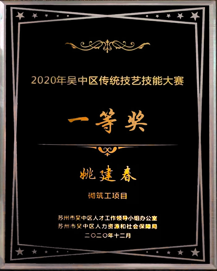 在11月中举办的吴中区传统技艺技能大赛中,我司香山人才培养计划师傅、古建筑瓦工技师姚建春获得了砌筑工项目比赛一等奖。